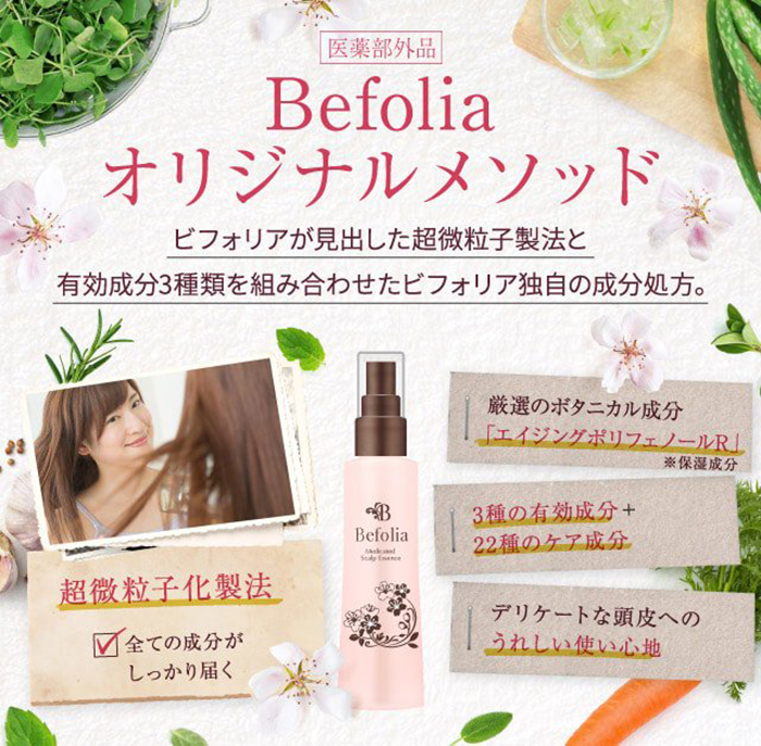 ビフォリア(Befolia)は、育毛剤170万本の販売実績を持っている株式会社リフレが女性のために開発した女性用育毛剤で30〜60代女性に人気なのよ。