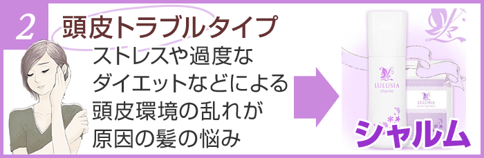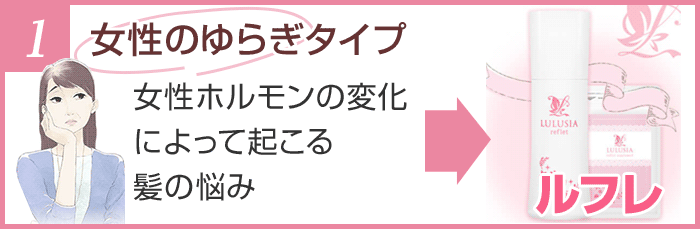 だから、加齢や女性ホルモンの乱れなどの「ゆらぎタイプ」に効果があるルルシアルフレと、気持ちの乱れや過度なダイエット、生活習慣の乱れなどの「頭皮トラブルタイプ」に効果があるルルシアシャルムの2種類の女性用育毛剤から選ぶことができるLULUSIA(ルルシア)がおすすめなのよ。