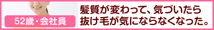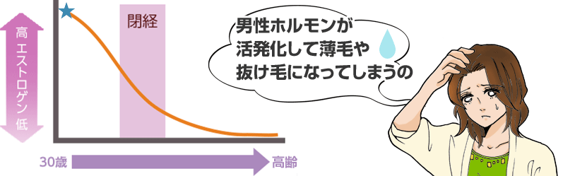 実は女性ホルモンの一種であるエストロゲンの分泌が減少すると、逆に男性ホルモンが活発になって50代女性の薄毛・抜け毛を引き起こしてしまうことも多いわ。