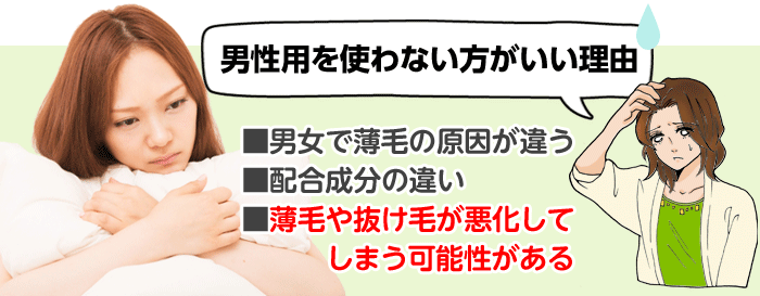 男性用育毛剤でも女性にも使える育毛剤があるかもしれないけれど、そもそも男性と女性では薄毛・抜け毛の原因が違うから女性が男性用の育毛剤を使っても薄毛・抜け毛が改善されるとは限らないし、逆に男性用育毛剤の成分が女性には強すぎて頭皮が荒れてしまうこともあるのよ。