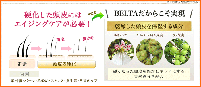 ベルタヘアローションは頭皮の環境を整える成分だけではなく、硬くなった頭皮を保湿して潤すエイジングケア成分もたっぷり入っているのよ。