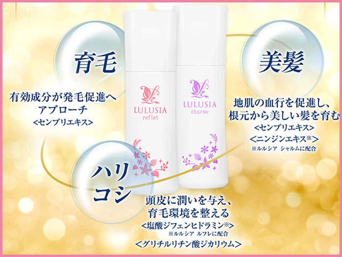 LULUSIA(ルルシア)は男性用育毛剤として実績があるイクオス育毛剤の販売会社が、毛髪診断士の監修のもと企画開発した女性用育毛剤で、20代〜50代と幅広い年代の女性に人気なのよ。LULUSIA(ルルシア)には女性ホルモン・加齢・産後の薄毛・抜け毛に効果的なルルシアルフレと、気持ちの乱れ・過度なダイエット・生活習慣の乱れに効果的なルルシアシャルムの2種類の女性用育毛剤があるから、自分に合ったものが見つかると思うわ。